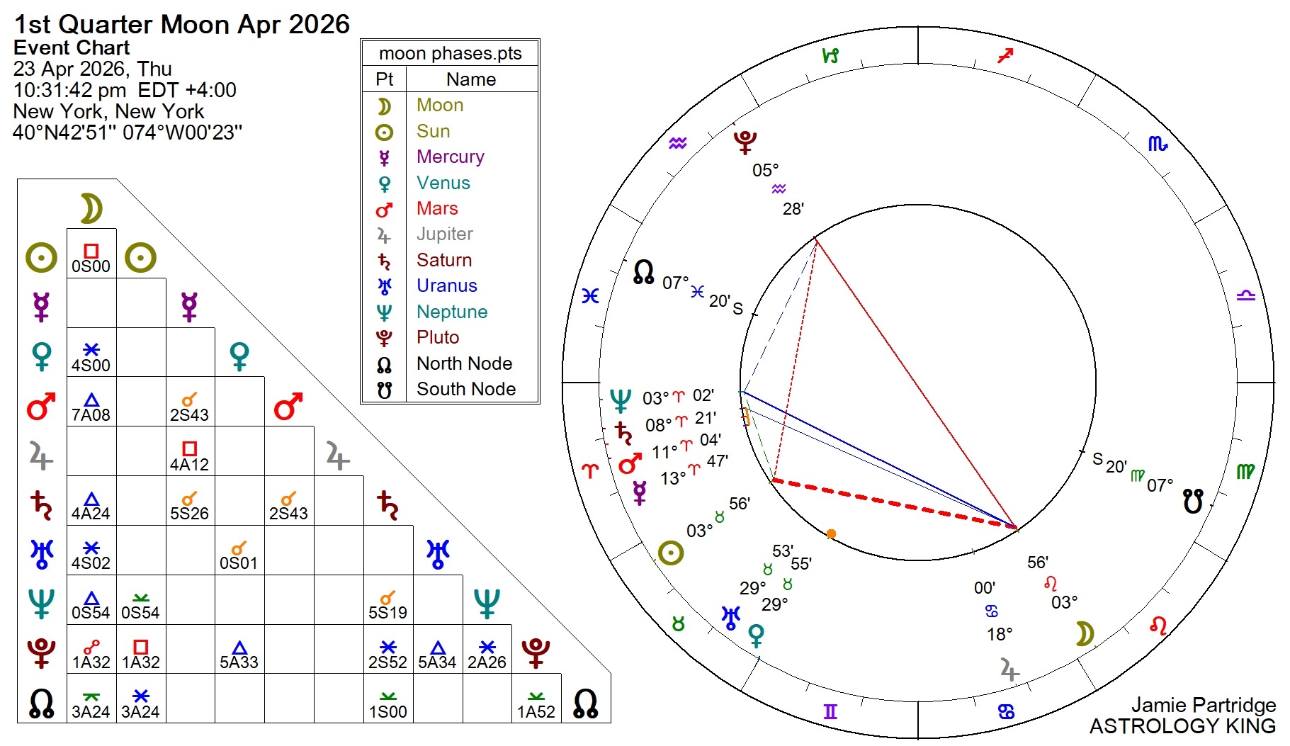 | Apr 23 | 22:31 | 1st Quarter Moon Apr 2026 | 03♌56 |