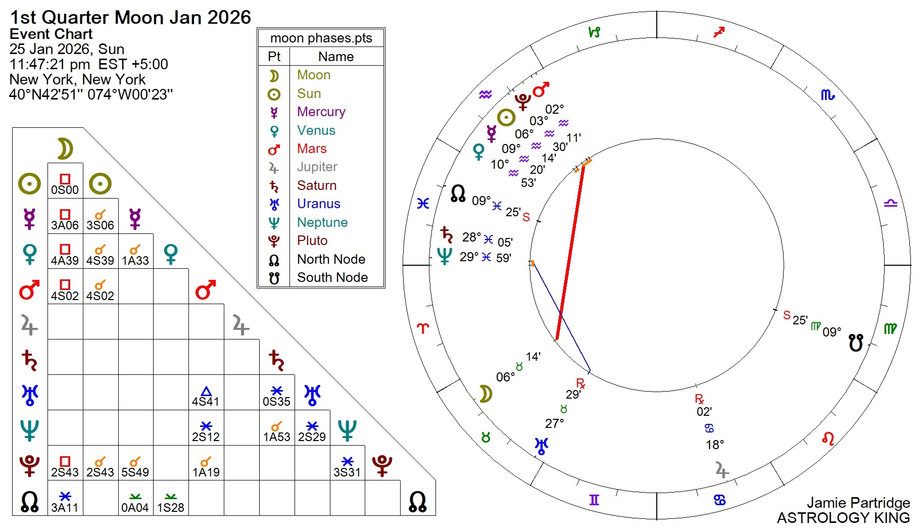 | Jan 25 | 23:47 | 1st Quarter Moon Jan 2026 | 06♉14 |