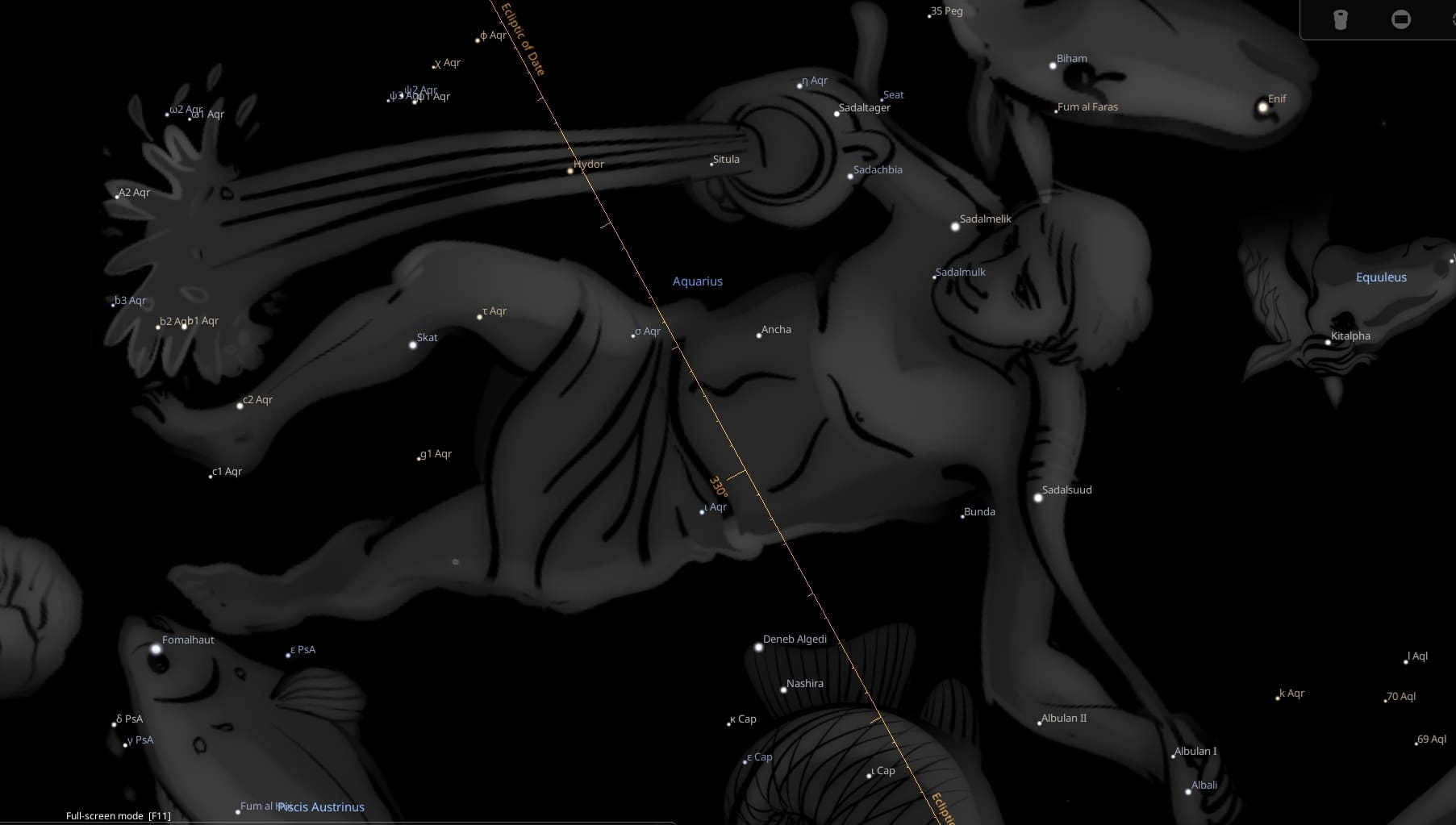 | 08♓55 | 09♓37 | ζ Aqr | Sadaltager | F3 | 3.65 | 1°40′ |
