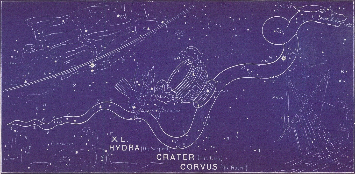 Legend. Apollo gave a feast to Jupiter and requiring water sent the raven with a cup (CRATER) to fetch some. On his way the raven noticed a fig tree, and, resting there until the figs became ripe, feasted himself upon them until, remembering his errand and fearing the anger of Apollo, he picked up a snake (HYDRA) and on his return gave as an excuse that it had prevented him from filling the cup. Apollo ordained in punishment that the raven should never drink so long as figs were not ripe, and placed the crow, cup and snake in the heavens as a memorial.