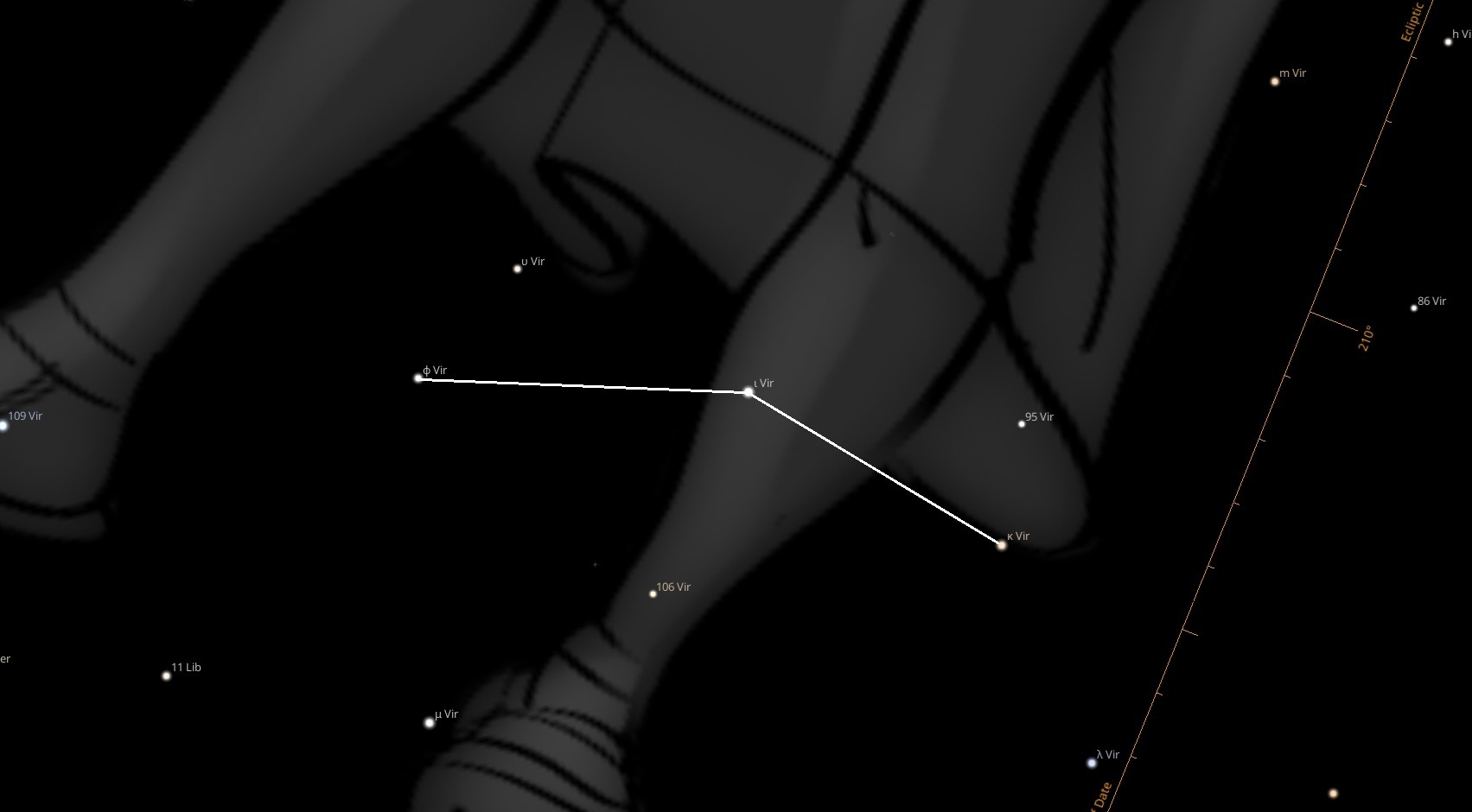 The stars ι, κ and φ Vir form a line on the Train of the Virgin’s robe. They were the Arabian ḣimār, “skirt,” of the garment. They formed the 13th manzil, Al Ghafr, “the Covering.” [2] (see κ Vir.)