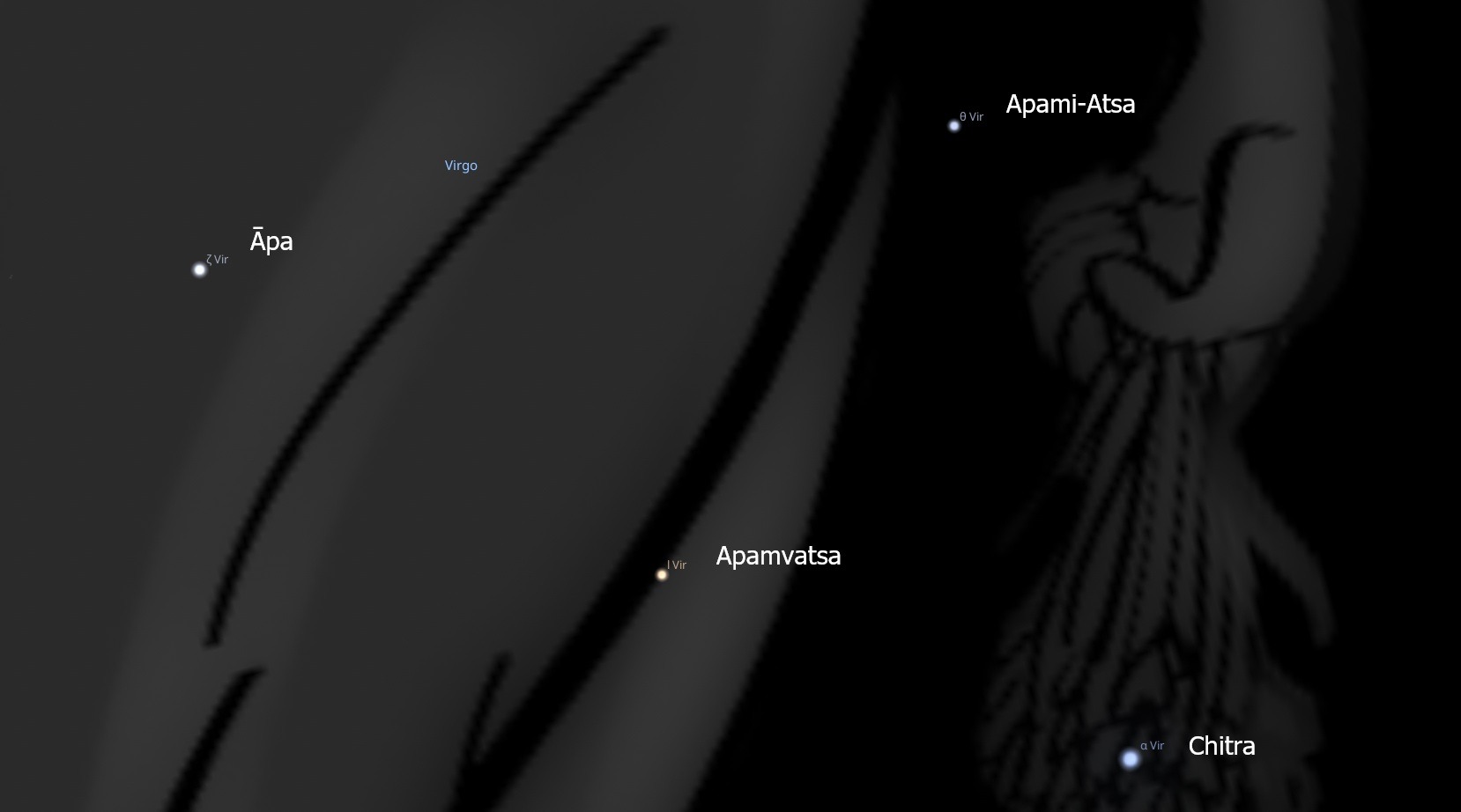 | 18♎14 | 18♎56 | θ Vir | Apami-Atsa | A1 | 4.38 | 1°20′ |