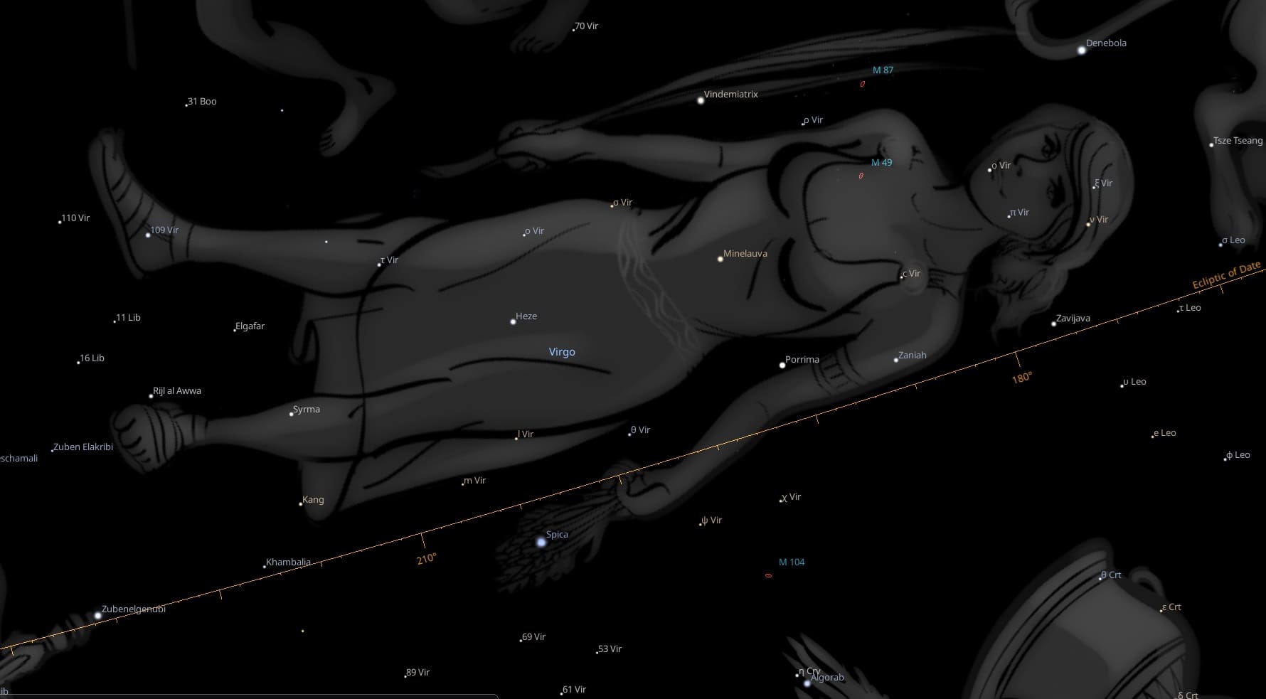 Constellation Virgo the Maiden is one of the 12 ecliptic constellations and lies between Leo and Libra. It also borders Serpents Caupt, Boötes, Coma Berenices, Crater, Corvus, Hydra and the obsolete constellations Mons Maenalus.