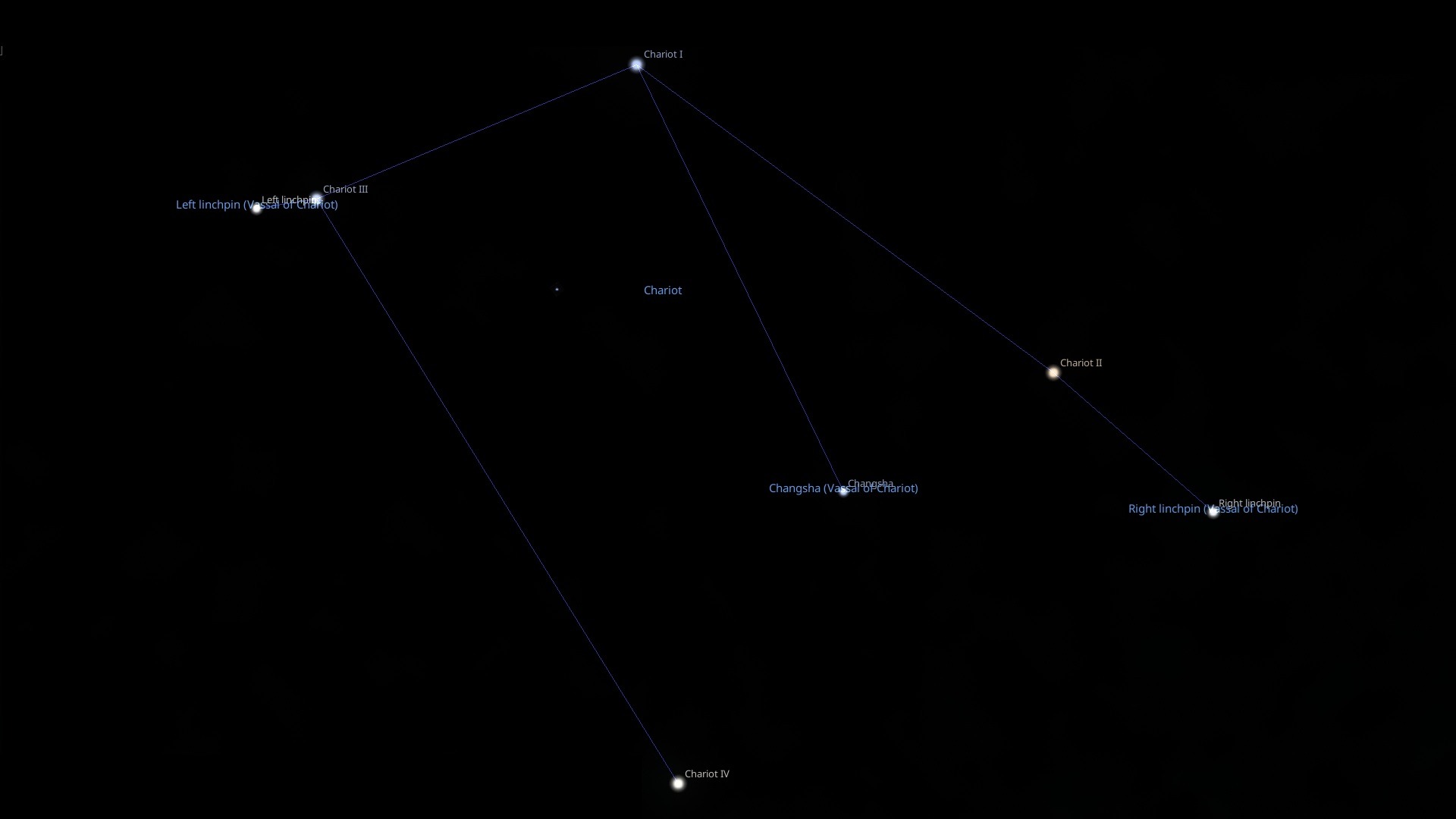The first asterism of the Chariot Mansion is Zhen. Its four main stars represent the Chariot. The next three single-star asterisms are attached to it: Changsha, Zouxia (left linchpin), and Youxia (right linchpin). Together, these first four asterisms are called the Zhen (Chariot) Constellation.
