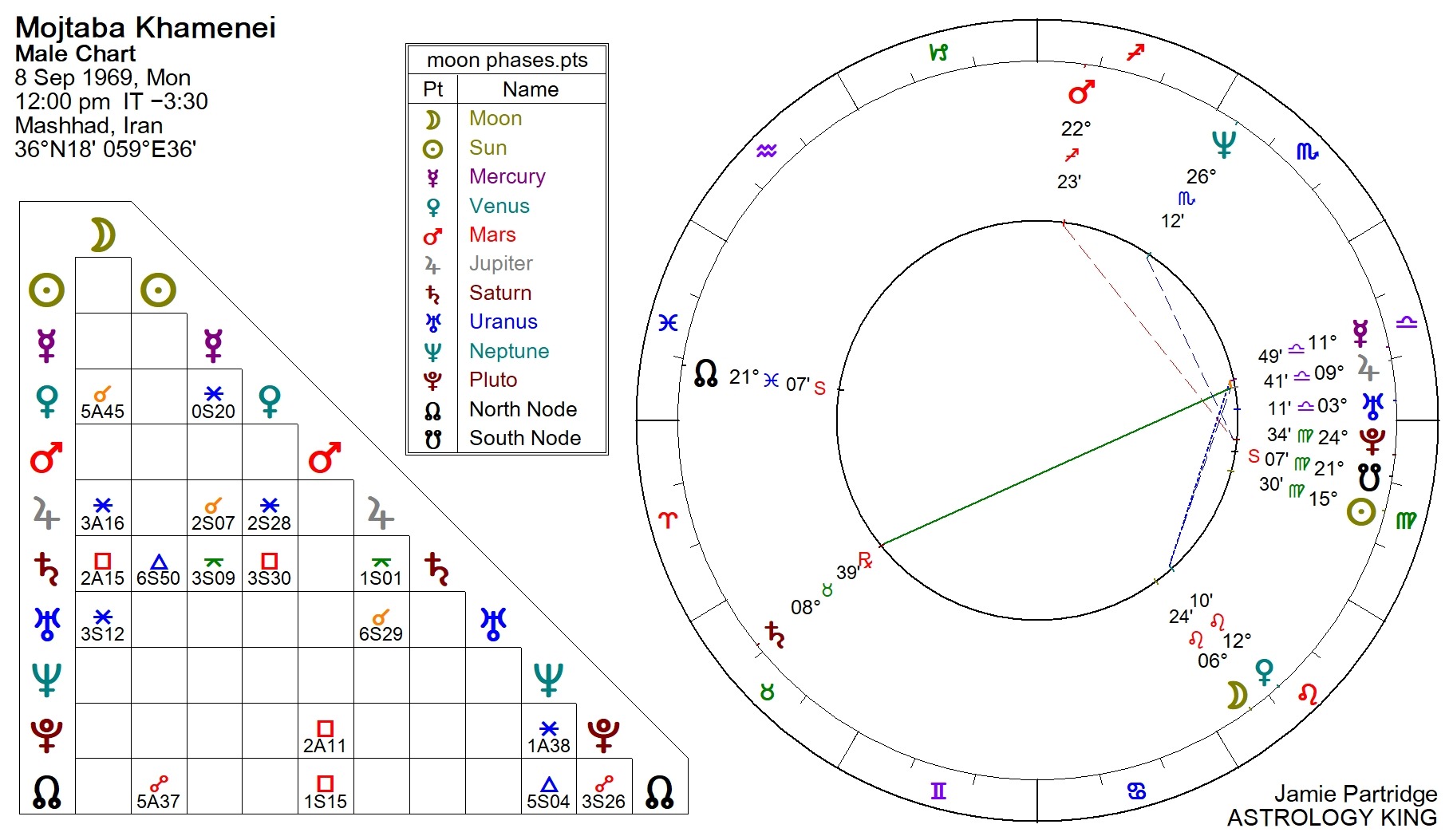 The orbs for the aspects and fixed stars in the interpretation are the greatest possible over the 24 hours of September 8, 1969, in Mashhad, Iran. Some will be stronger, and some will be missing. But at least we know Mojtaba Khamenei definitely has these stars and aspects in his chart.