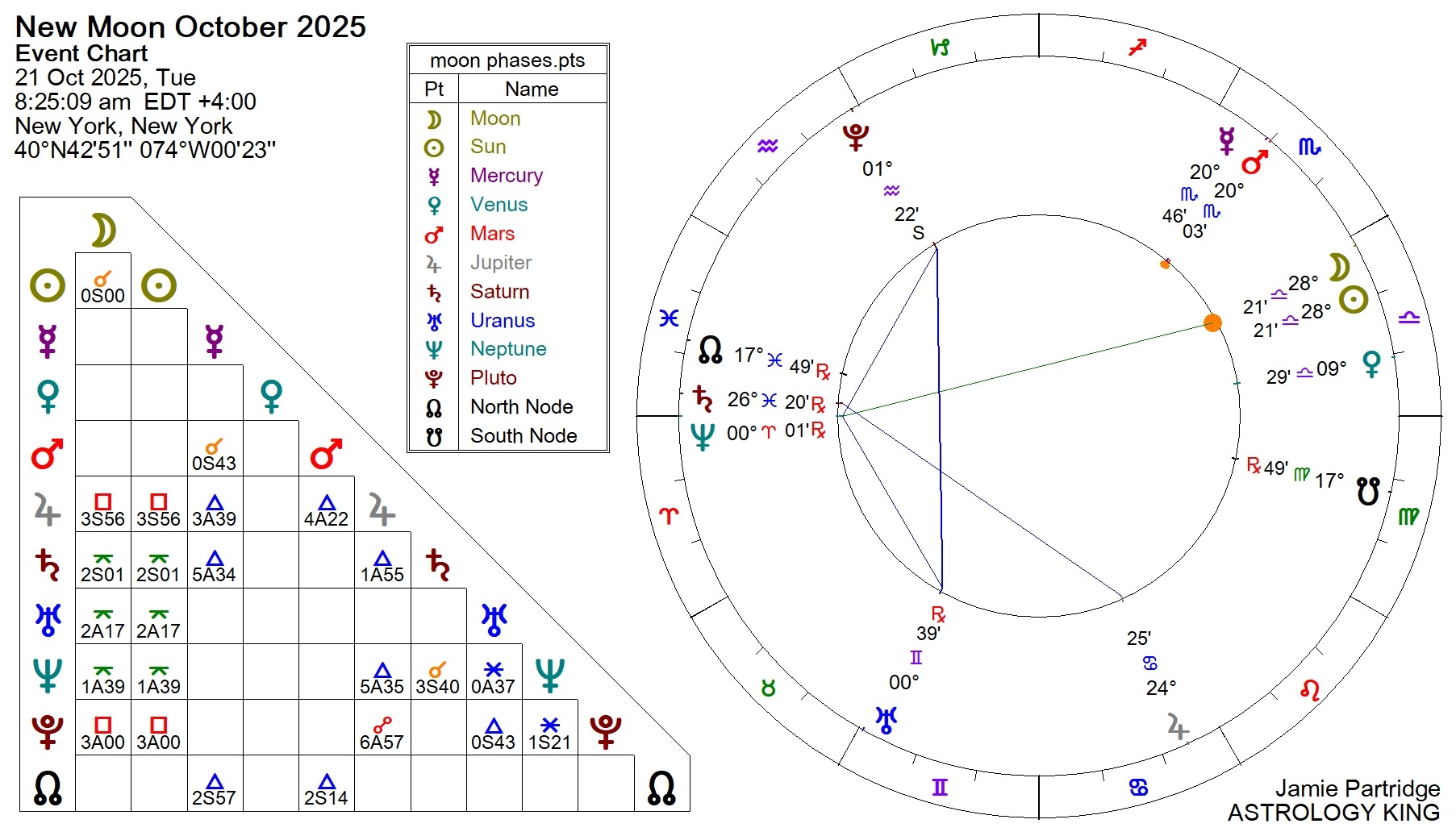 08:25 am – New Moon October 2025 at 28♎22 aligns with fixed star Izar at 28♎27. It inspires strong passions, artistic feelings, and gains through women and friends, as well as honor and preferment in martial affairs. This star also holds a more profound significance. From long before the present, it was revered by ancient Peoples, especially in Africa and South America, as a star from which their ancestors had first come to this planet. It instills a keen interest in our origins and a protective nature that wants to see us thrive safely into our future development as a life species.